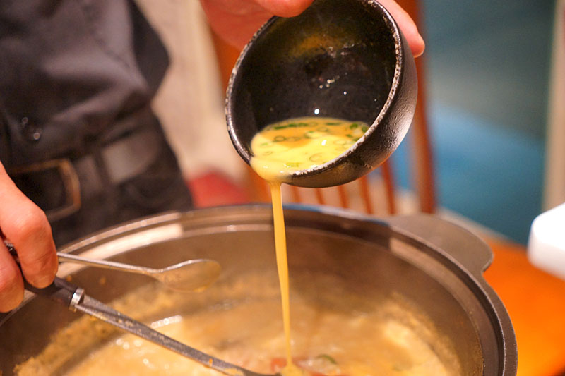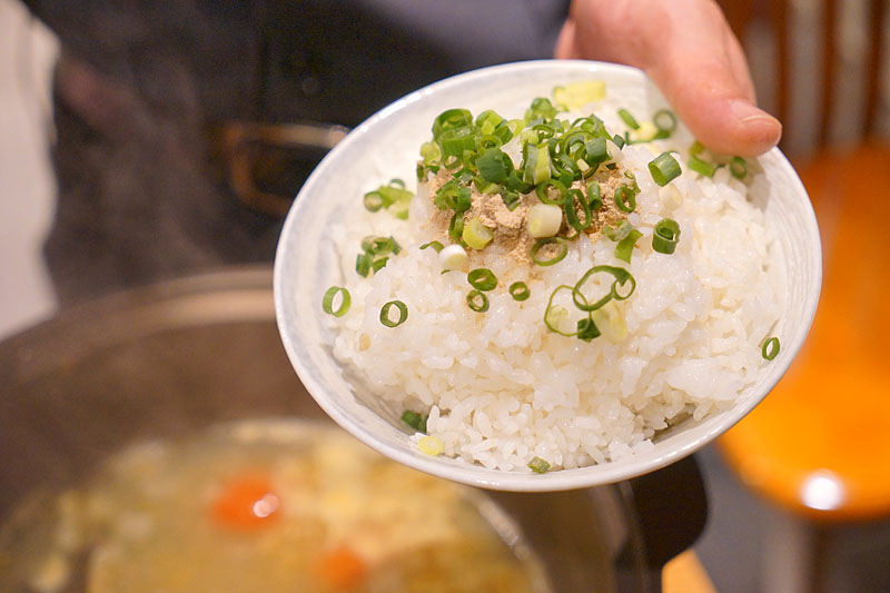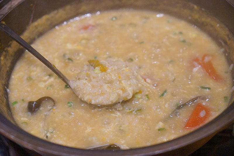 最後把海鮮吃差不多後,店家準備了一碗飯,上面還撒上蔥花,整碗倒入鍋中慢慢熬煮,讓粥內的米粒也可以吸收湯汁的味道。