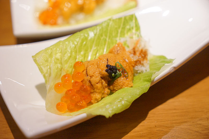 豪華三色曼羅船,用蘿蔓葉當底座,加上晶瑩鮭魚卵與馬糞,感覺還有些蟹肉?超濃郁的味道!