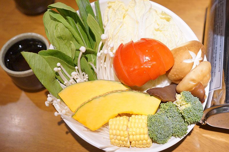 附上的火鍋菜盤,有番茄、南瓜、玉米、香菇、金針菇與花椰菜等等。
