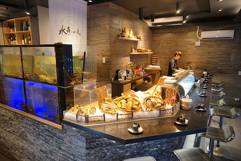 這裡一共有兩樓的用餐空間,一樓是偏向吧檯式的,可以近距離看到廚師料理一些食材的過程,許多的活體海鮮也放在一樓,都可以直接現場的水缸中看到。