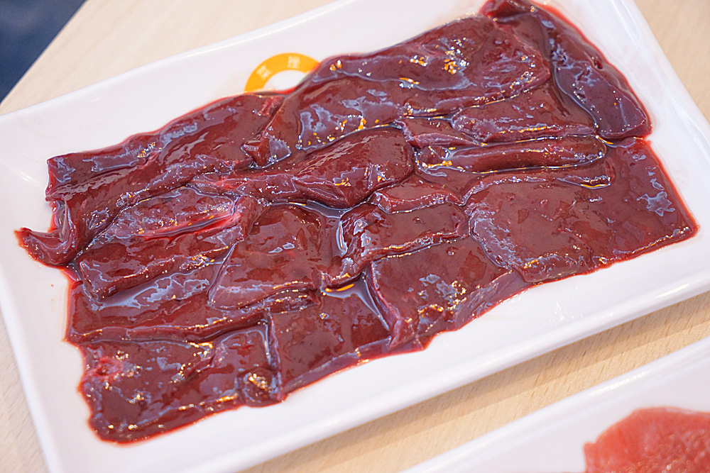 這是牛肝,有些偏暗的朱紅色,但又覺得有些閃閃發光的模樣,第一次看到覺得頗妙的,牛肝需要涮久一些,吃起來有些粉粉的感覺。