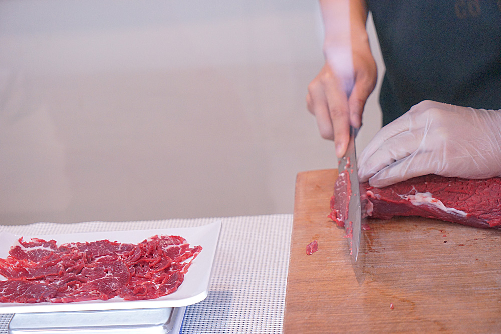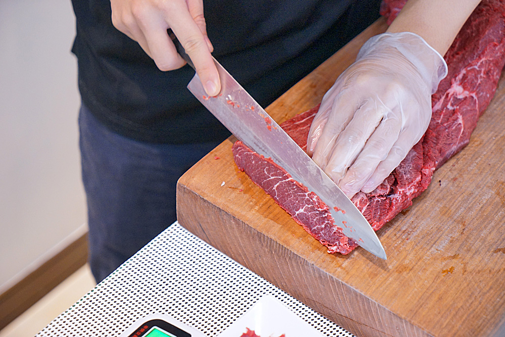 拿肉的手都有戴上手套,切好後就會進行秤重。