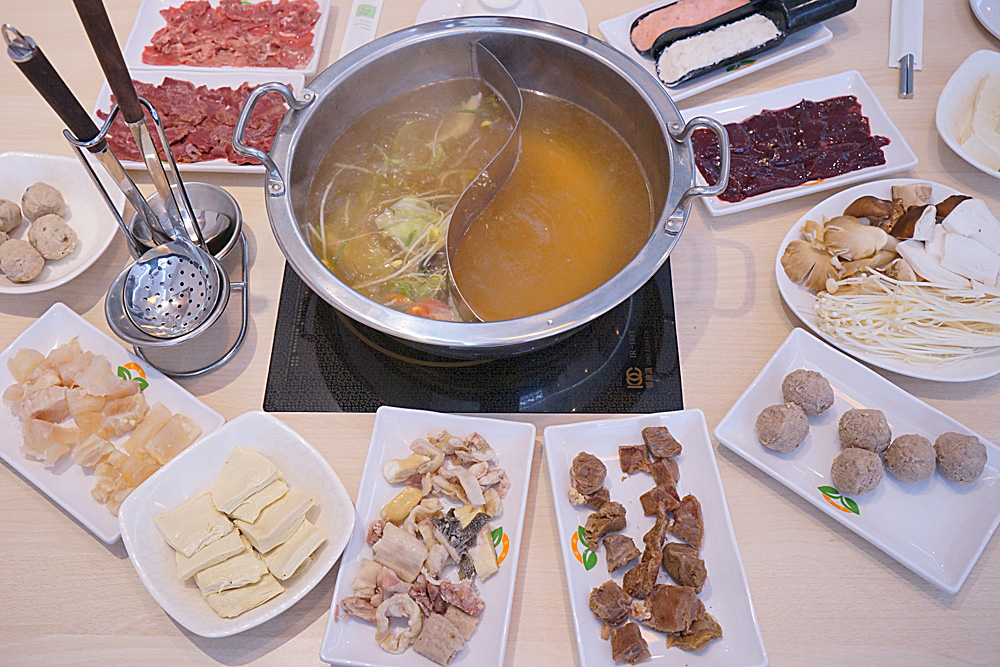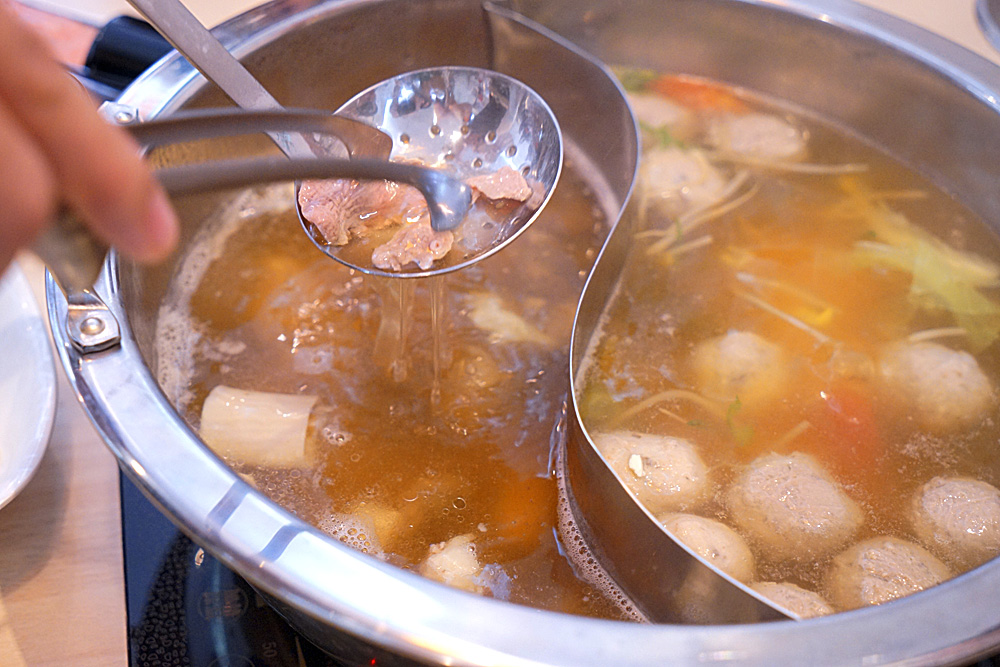 這裡的鍋也是鴛鴦鍋的模式,不過吃法上卻不是一般的鴛鴦鍋,右邊有料的是加鍋料的區域,另一邊單純湯頭的,則是用來涮肉用的,可以避免肉渣肉末影響到另外一邊,