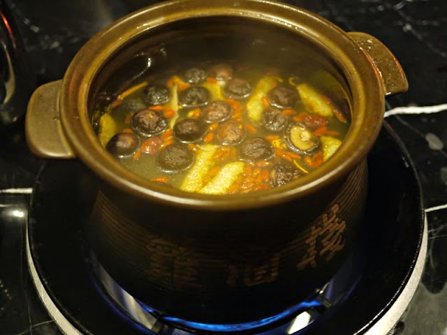 在等全酒雞煮時,老闆又介紹另一鍋用半酒悶煮的四物,這鍋有:青耆、紅棗、枸杞、當歸,原來煮好的全酒雞會倒入這鍋半酒四物鍋中,全部倒入鍋中後,還要再蓋上煮到滾後才能開賣。