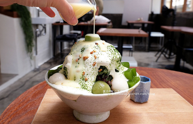 抹茶控不能錯過的冰品,裡面藏有鬆軟微甜的紅豆,滿滿的雪白生乳醬覆蓋其上,如果是藍色的就像富士山了,旁邊附有白玉和抹茶凍,QQ的頗有嚼勁,再依個人喜好淋上醬汁。
