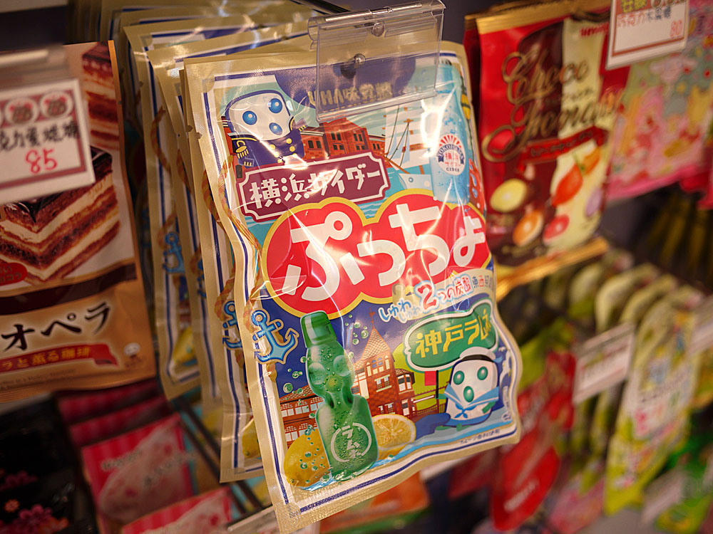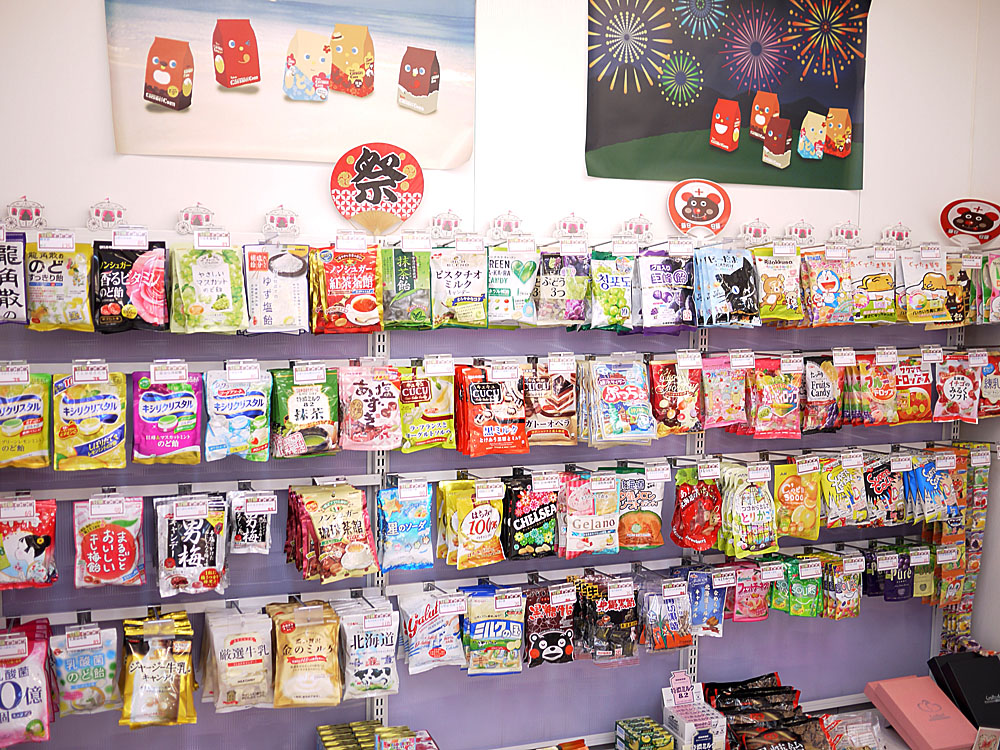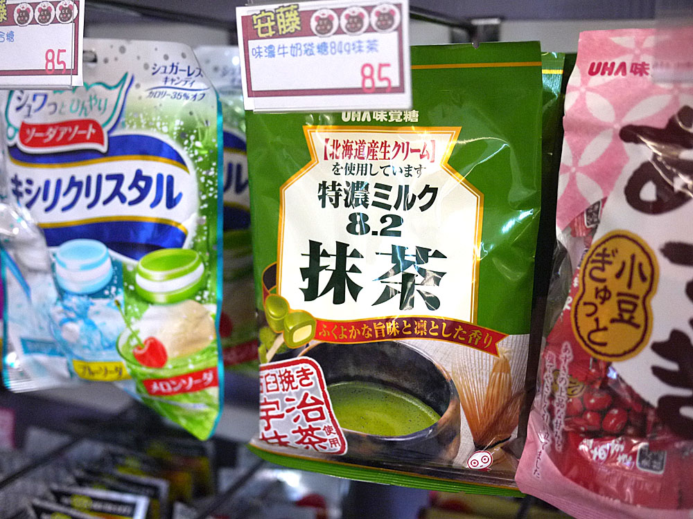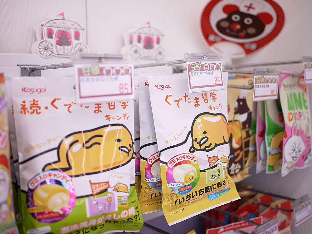 邊邊處放著許多日本進口的零食與糖果,總類之多,有小叮噹、蛋黃哥與女生超愛的抹茶系列商品等。