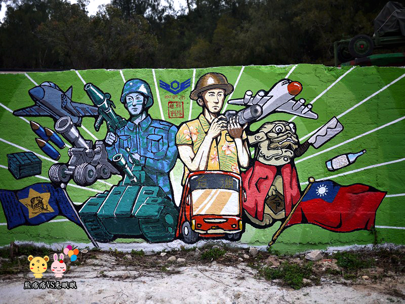 週遭的牆壁上,有許多軍事化的塗鴉,右邊風獅爺拿菜刀的模樣是哪招啊?