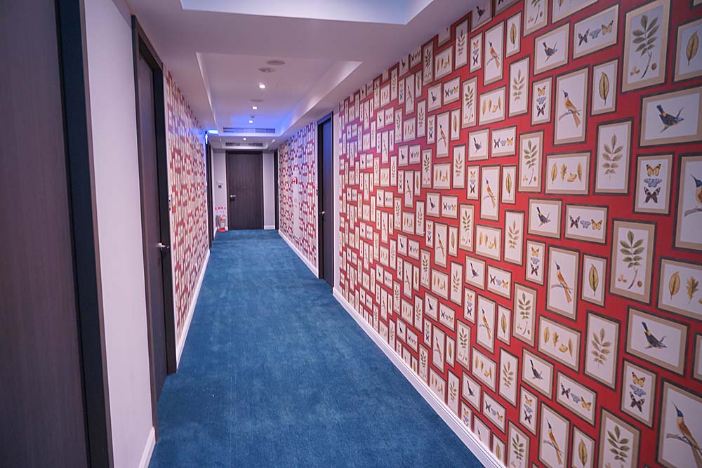 走廊上貼滿了各式各種鳥語花香的設計,有別於一般死死板板的飯店模樣。