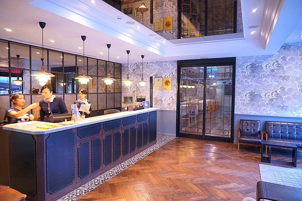 一進門時,首先你會被這設計十足的裝潢給吸引住,有點復古風格的元素,有帶有時尚新穎的設計搭配著,抬頭看,天花板上還有一面鏡子,直接複製出另一個空間感來。