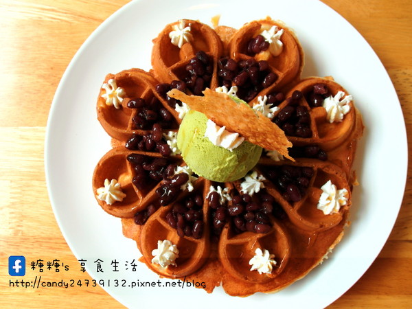 讓糖糖期待已久的抹茶鬆餅終於登場囉,糖糖就是為了他而來的,小週末的鬆餅是採水滴型的形狀,好像一朵盛開的花兒,正在綻放他的光彩呢。