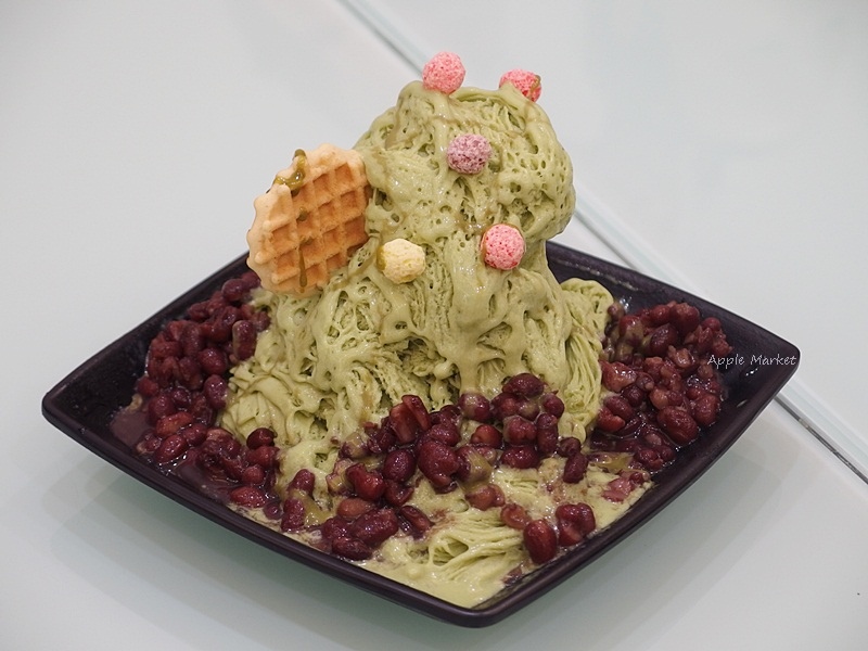 美得像朵花的抹茶口味“木長園”(140元),用的是木長園的抹茶加上白巧克力來調配,裡面還加了抹茶蛋糕、黑糖麻糬和蜜過的萬丹紅豆,抹茶的氣味很濃郁~加上白巧克力多了甜蜜的奶香風味,最後加上紅豆質樸的口感~這一道我很喜歡。