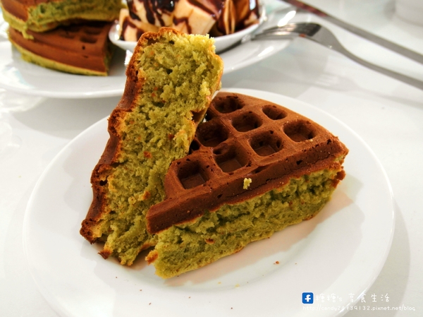之前來都是吃原味的,這次挑了帶著翠綠的色澤,散發著清新抹茶香味的抹茶鬆餅,咖啡鑽的鬆餅就厲害在他不只是厚,吃起來也相當的紮實,帶濕潤感,所以口感不會很乾,表皮還帶點微焦脆的感覺,讓你一次可以吃到香脆、紮實又綿密等多層次風味的鬆餅。