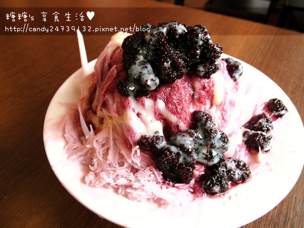 桑椹含有豐富的鐵質、維他命、蘋果酸及葡萄糖,有提高細胞免疫力及治療青春痘,是女孩們的補血最佳聖品,有是男孩們的補腎妙品唷 ,將新鮮桑椹打成果泥製作而成的雪花冰,淋上店家自行熬主的桑椹汁及新鮮的桑椹果粒,吃起來酸酸甜甜的,口感非常清爽又消暑 。