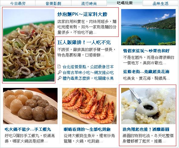 狂賀!100/12/18日,熊痞痞VS兔眠眠的3篇文章,登上奇摩首頁>吃喝玩樂內,分別為:金門炒泡麵、酒釀湯圓與爆漿雞排,目前三篇文章不定時輪播中,亦感謝網友雅築、酷酷少分享圖片給我,以下為圖片。