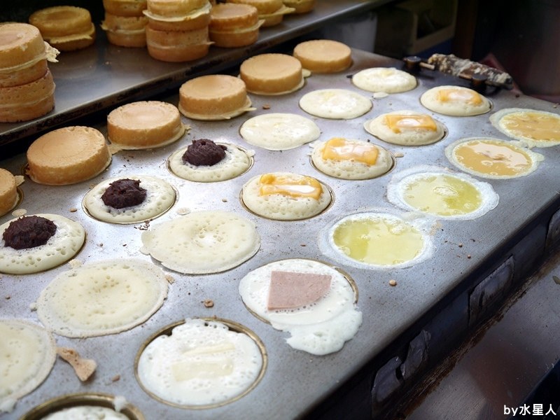 小凉點了起司蛋與奶油珍珠,起司蛋是整顆蛋下去唷!!!我喜歡他家的餅皮是帽子狀,不像一般紅豆餅是外圈對擠入,這種帽子狀互相疊起可以讓內餡裝的更多呢,店家的起司蛋不是給半熟蛋唷,所以會將蛋黃與蛋白一起打散再慢烤,珍珠給的量就是如此的多,那奶油或紅豆呢?