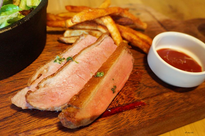 商業午餐-嫩煎宜蘭櫻桃鴨胸880元,商業午餐把所有人的胃都顧到了,想吃魚的有魚,牛肉、豬肉、鴨肉通通都有。鴨肉也不馬虎的選用來自宜蘭的櫻桃鴨胸,鴨胸的熟度處理得相當好,美味的鴨胸就是不該乾柴,剛好的粉嫩好入口呀!