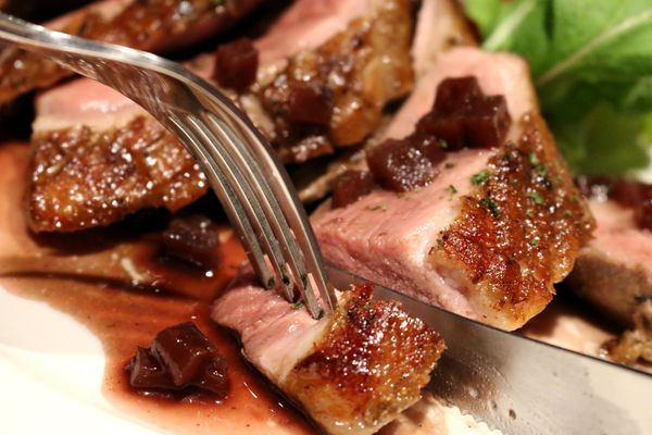 外皮略焦硬,鴨肉口感紮實不乾柴,脆皮油脂香,盤邊的櫻桃紅酒醬,櫻桃味較重,味道偏甜,推薦搭配玫瑰鹽更優,很能提味,鴨胸嫩感充滿口腔,令人滿足。