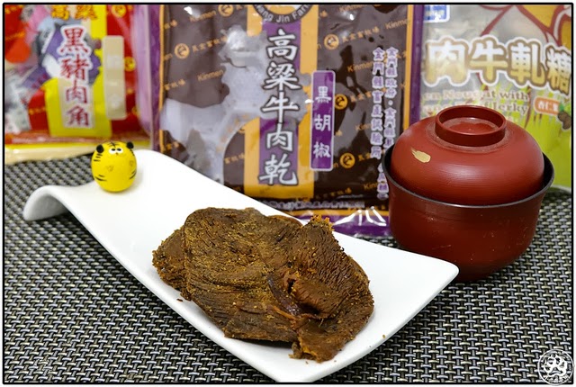 了原味外,良金也有提供「辣味牛肉乾」,更甚是這種「黑胡椒」口味,吃、嚐起來多了「黑胡椒」的點、刺輕香辣挺過癮的,個人覺得它更適合拿來配茶、下酒,因為辣味略重,也比較顯舌。