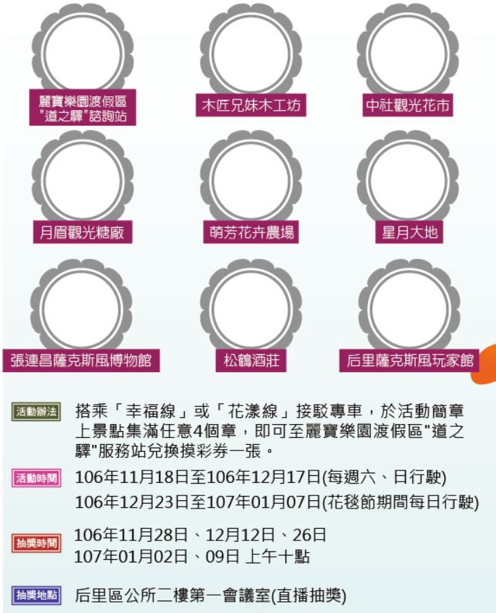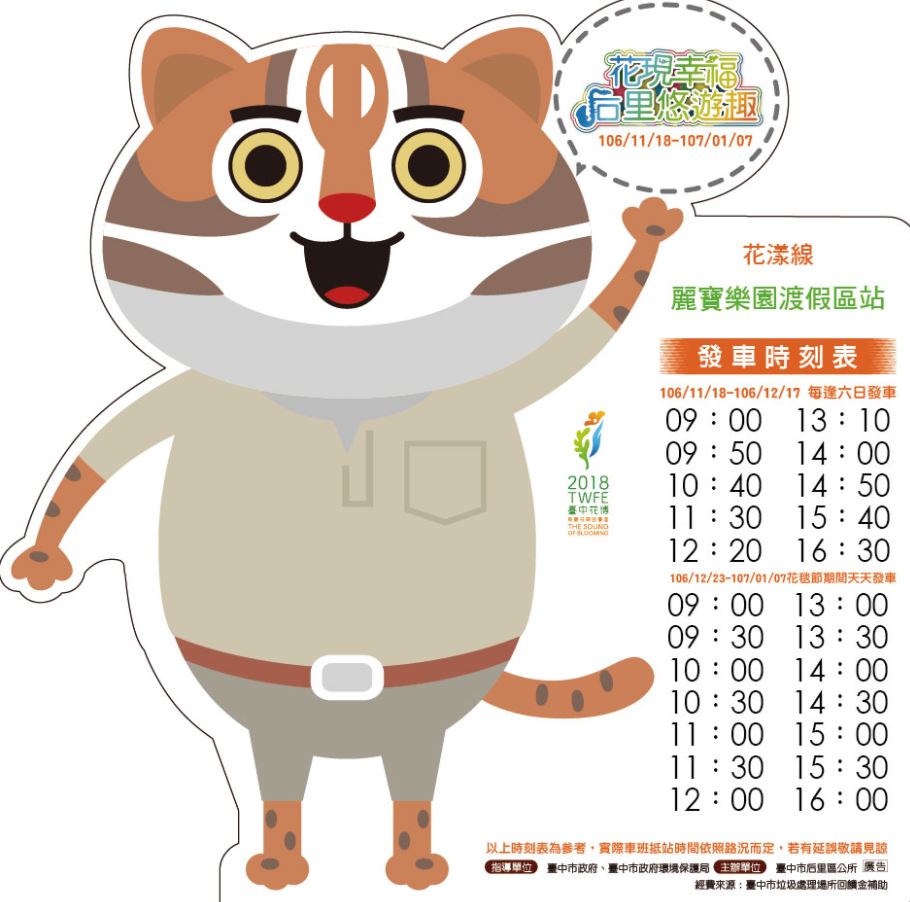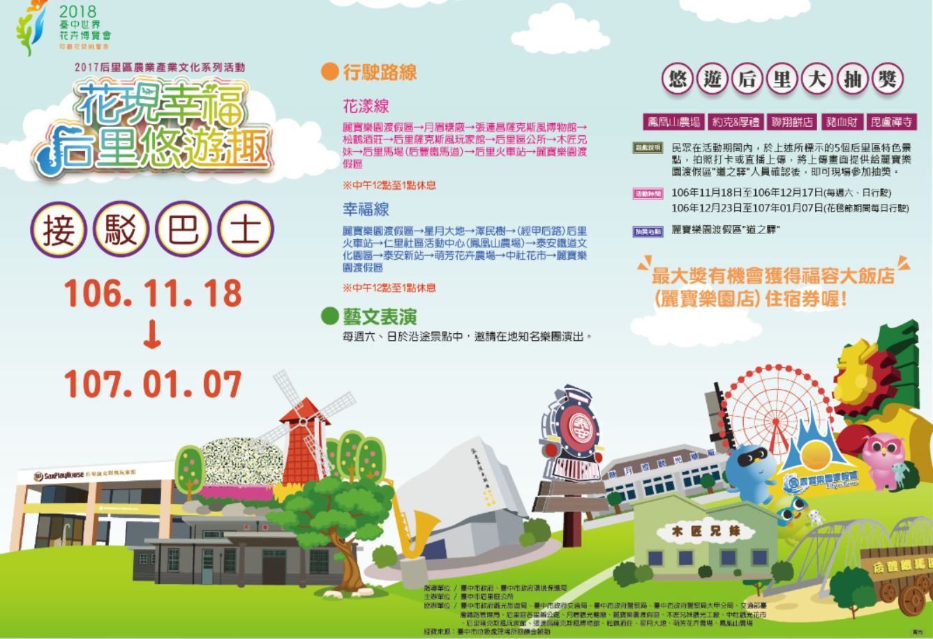 花現幸福后里悠遊趣將於106年11月18日(9:00-17:00)隆重登場,后里為2018台中世界花卉博覽會最大展區,本次活動也算是為了花博與2017臺中國際花毯節熱身!透過接駁巴士及隨車導覽,讓民眾可以更加認識后里區的民俗風情與各大景點,花博吉祥物石虎家族也會不定時隨車同樂,為明年花博宣傳。