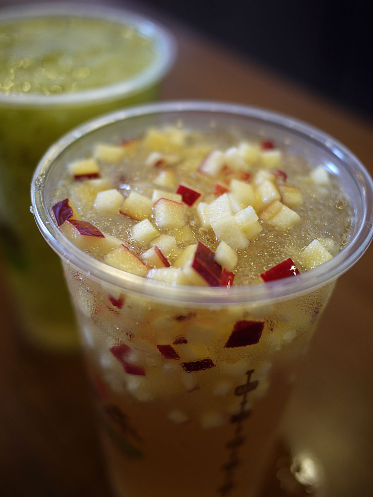 仔細看看,都會發現有將近1/3的份量,都是料耶!左邊的點頭奶茶,還有厚實的大甲芋泥,右邊的晶粹香蘋,則是滿滿的蘋果丁。