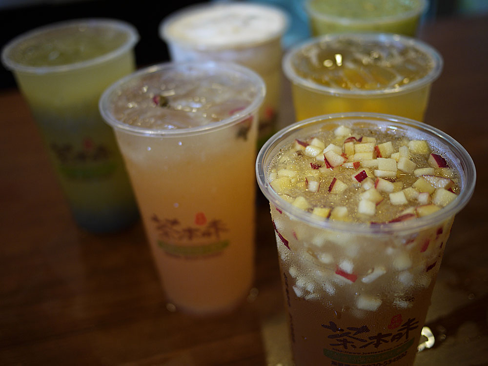 一排排的飲料,每一杯都是夏季主打曲,包含蜜桃綠茶、清檸玫瑰飲、甘蔗檸檬、點頭奶茶、冰鑽奇異果Q凍與晶粹香蘋。
