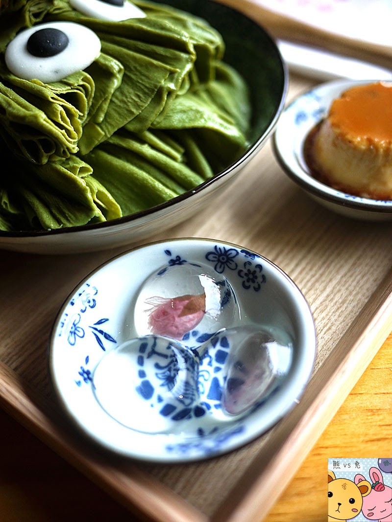 宇治抹茶的冰,上面放上兩個可食用的眼睛,吃起來沙沙的,抹茶屬於微苦的滋味,不是那種很苦的,新手可以接受。