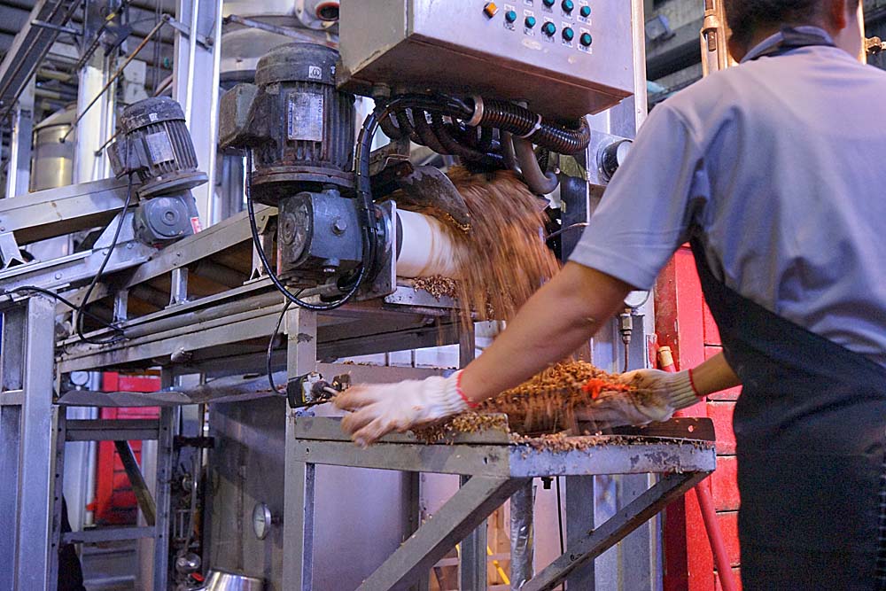 傳輸帶最後會將發酵好的高梁送到一位年輕女性師傅手上!疑?你沒看錯!真的是女生耶,動作卻很熟練,一點不輸男生在作業。