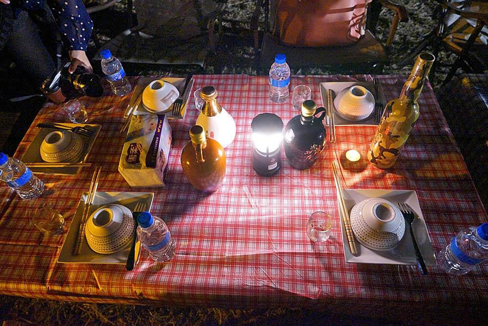品完酒後,一群人就來到了草皮區,這邊有著營火,有著帳篷與一些野餐桌椅。