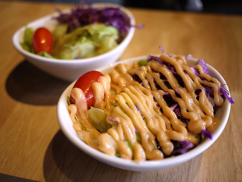 沙拉部分有兩種選擇,分別是千島醬與和風醬,一個偏甜一個偏酸,可依自己口感決定。