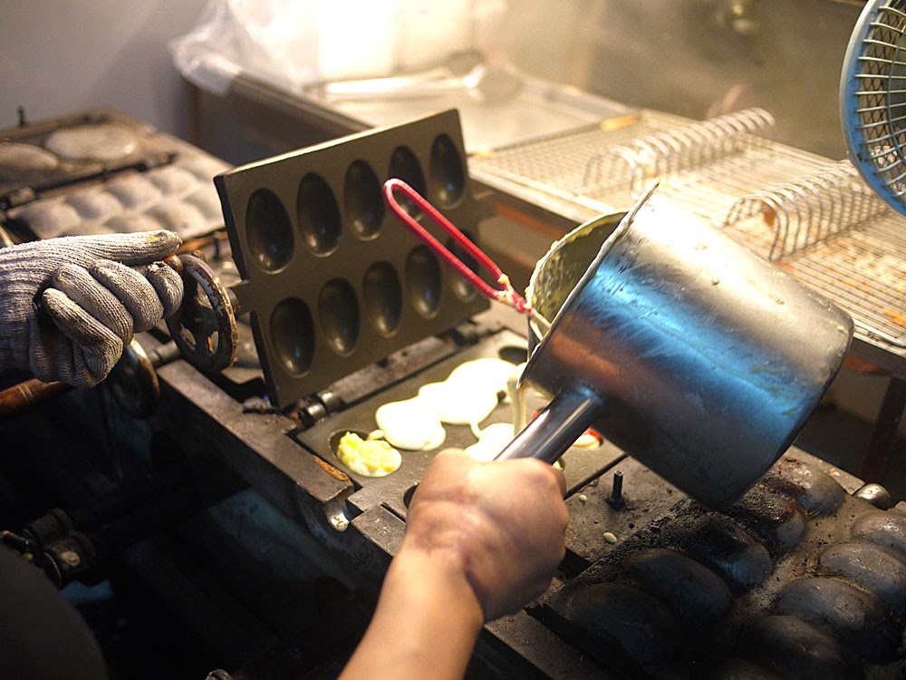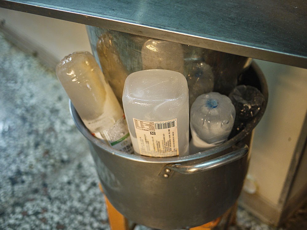 此時老闆娘就讓我看她的麵糊,然後說:「你可以用手去摸外面那些瓶子,我們家的麵糊都是自己打的,是真的有加雞蛋,沒加一些不該加的東西,所以需要冷藏,不能脫離太久會壞掉,才用很多層東西放在外面保冰這樣。」這樣太酷了吧!