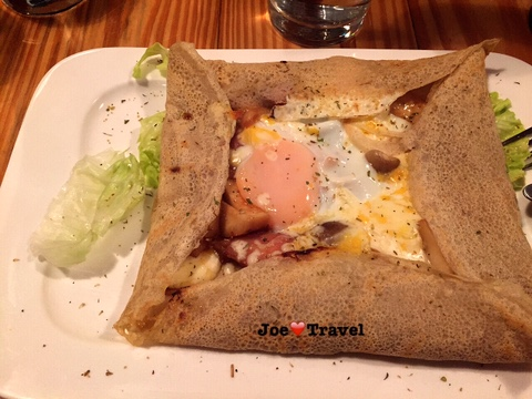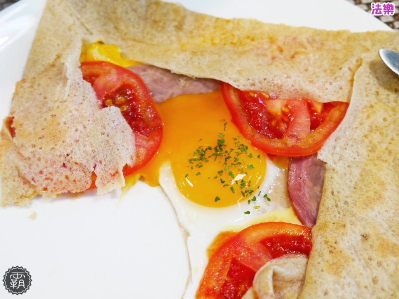 可以看到櫻桃鴨火腿、蕃茄切片圍繞著中間是黃澄澄的蛋黃,最外圍就是薄片,鹹口味的薄片通常稱為Galette以蕎麥粉為主體,比較薄比較香脆些。看到蛋黃的顏色是比較深的,大概就知道營養成分比較高,如果不敢吃生的,他們也可以煎成全熟。