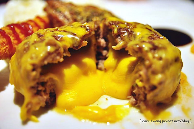 一刀切開,蛋黃潺潺流下,視覺上可真是誘人的,起司控應該會很失心瘋唷!漢堡排本身很軟嫩多汁,還帶了肉的香氣,伴隨著起司一起入口,整體而言又更加豐富有層次感…建議搭配白飯一起吃,很下飯哦!^^