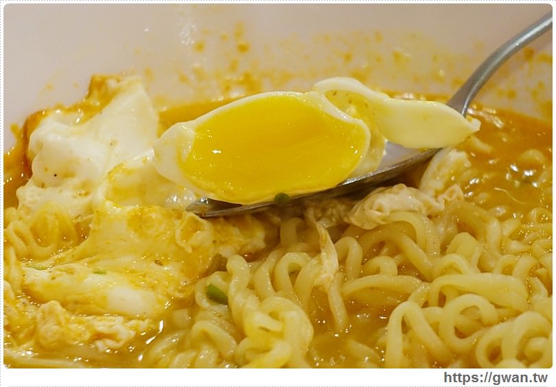 配料比較簡單,又另外煮了半熟蛋,韓國的起司泡麵不是你想的上面會有起司片或起司絲那種,它們會附起司粉灑在湯裡,重點就在湯頭喝起來有起司香,還帶有微微辣度,裡面有一顆邪惡半熟蛋,剖開來金黃蛋液就直接流下來了。