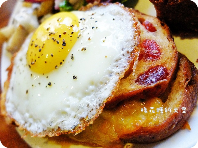 接著,這上層還有顆誘人半熟荷包蛋的吐司,就是「法國嗑女士」唷!據說這輕食可是大受好評啊!切開吐司你就會看到黃涔涔的蛋黃流下來,誘人!吐司裡面也是大有文章,夾了一塊火腿之外,中間還塗了松露油唷!整個吐司味道超好的啊!