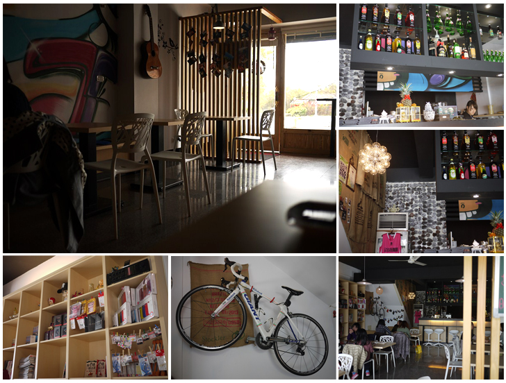 雖然我們去的時候是中午,但環境上的佈置蠻有氣氛的,最酷的是,竟然有一台腳踏車被放在牆壁上耶!咖啡廳放這台也太妙了吧?