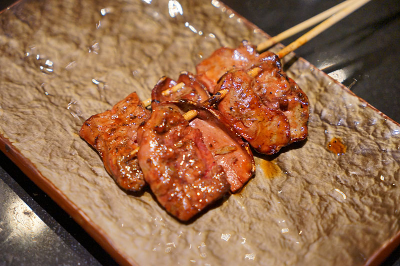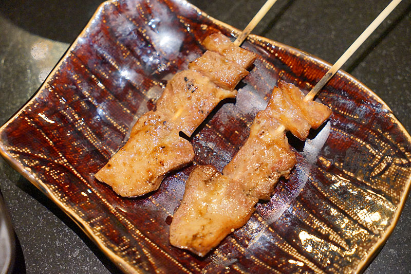 烤牛舌,我原本以為是一片片略捲的那種,結果是把它串再一起的模樣。