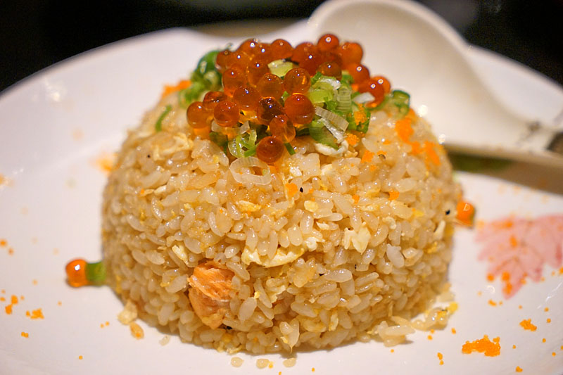鮭魚親子炒飯,這一道建議必點,原本只是想要讓自己吃飽一些才點的,沒想到炒飯的調味讓我一口接一口,首先是擺盤部分,弄得圓滾滾的很討喜,上面在舖滿鮭魚卵與蔥花,底下炒飯顏色看起來不重,搭配的醬油應該有特別挑選,味道重卻不嫌膩又下酒,好想再來一碗阿!