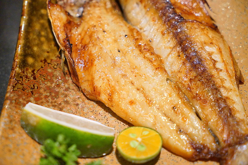 午魚一夜干,表面烤成金黃微焦的模樣,皮的部分有些脆脆的。