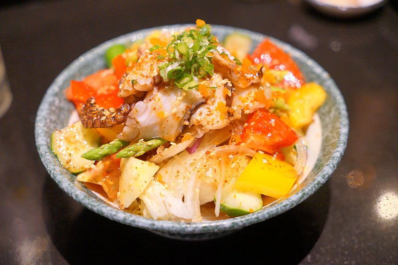 章魚巨足沙拉,色彩擺盤繽紛,裡面有不少的塊狀章魚腳,味道簡單不重鹹,酸甜滋味搭配七味粉提香。
