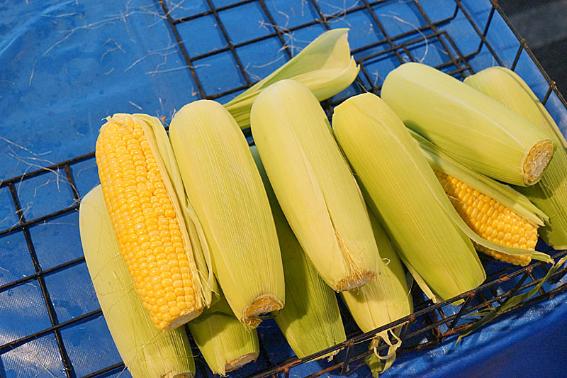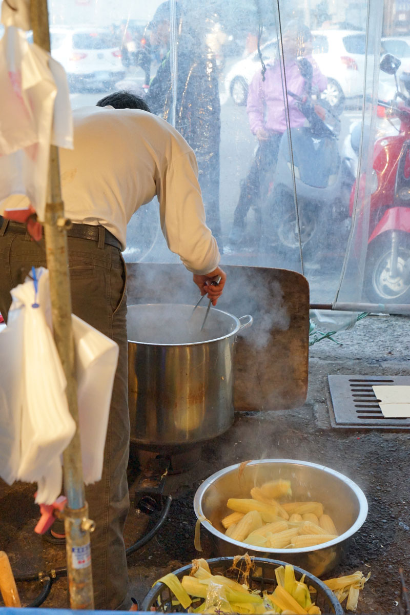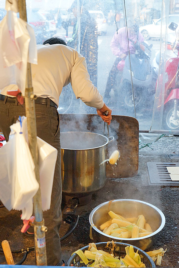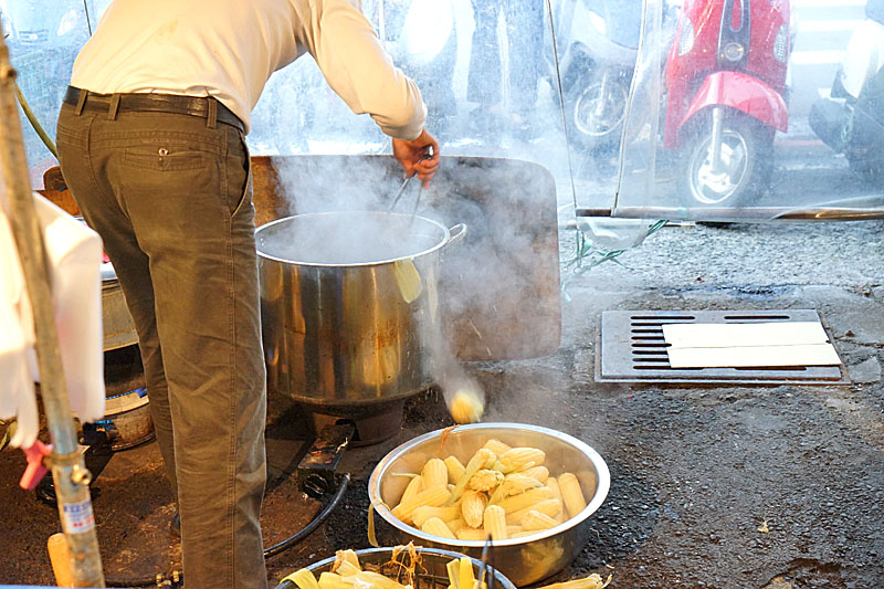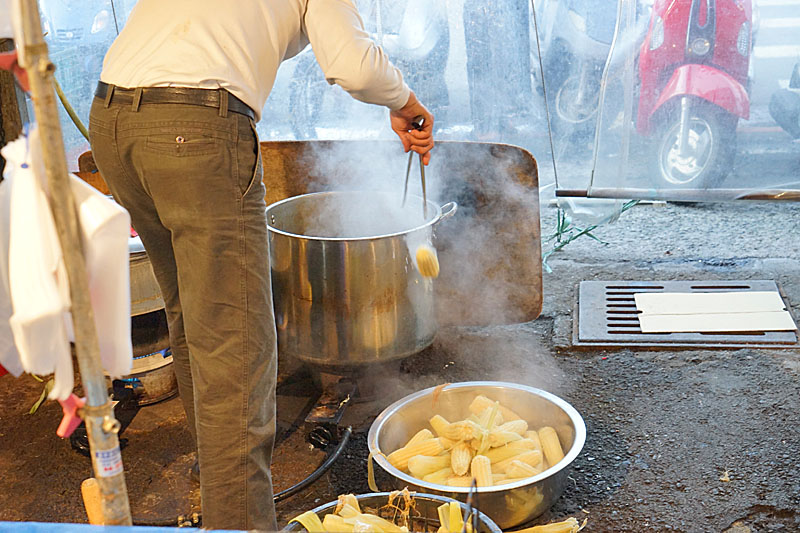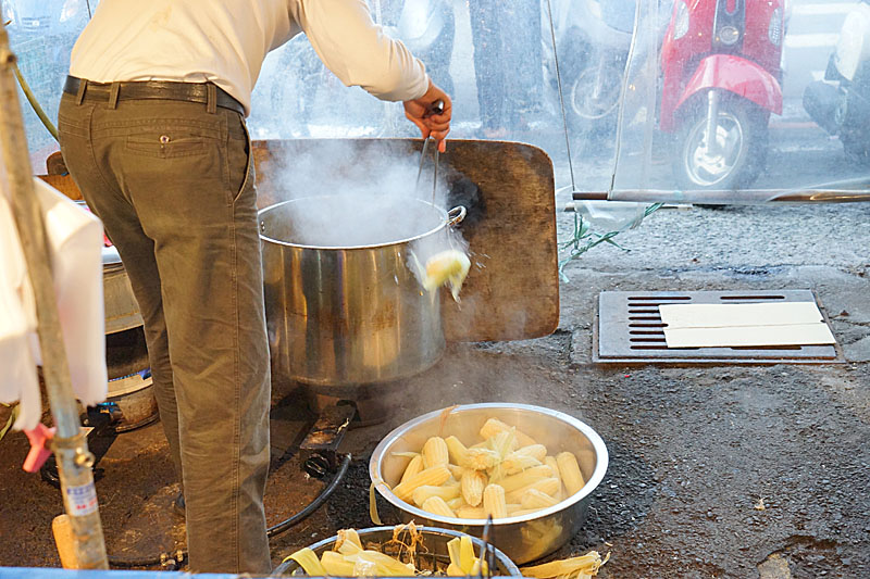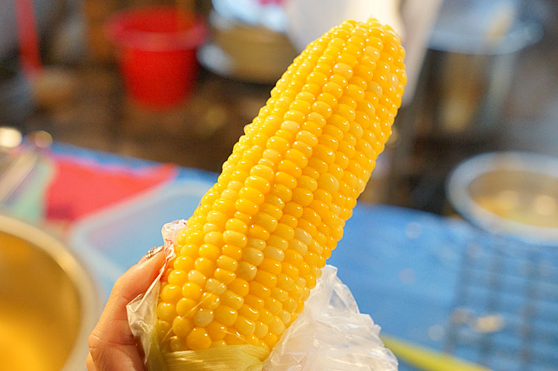 老闆根本頭也不回的,就一根接著一根的丟進去,精準度很高,薑還是老的辣!每一根玉米都還在冒煙的姿態下飛高高又殞落,結果重點都變成再拍老闆丟玉米的畫面了(大誤)。