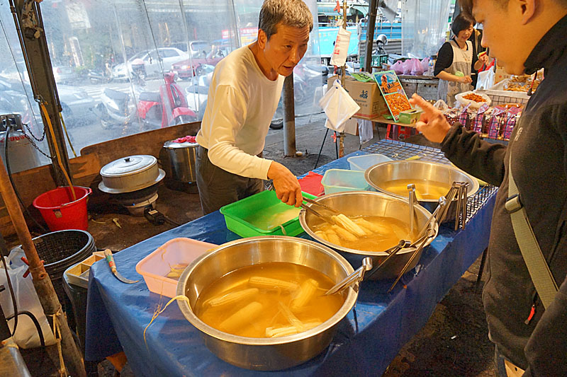 這就是老闆,前面擺著三大盆的玉米,認人應該不難吧?沒有其他明顯的辨認方式了…