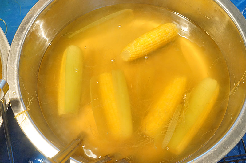 對你沒看錯…玉米直接從大桶子丟到盆子中。