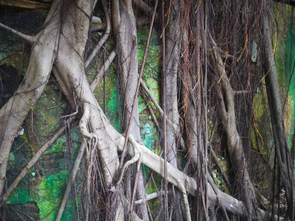 從一樓往上逆光拍,看著樓上垂下來的鬚鬚,真的很像電影的場景耶。