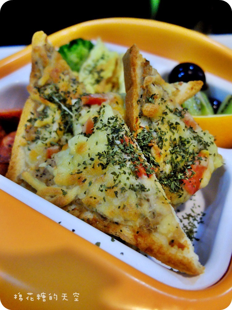 兒童餐的主餐部分是店家親手製作的Pizza吐司,分成燻雞培根和鮪魚兩種口味!把很多小朋友原本不敢吃的青菜包在起司裡,讓小朋友高高興興的吃進嘴裡~