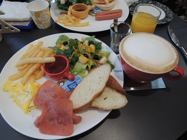 點了法國麵包元氣餐和原味貝果元氣餐,都附沙拉、薯條、火腿、熱狗,就麵包不一樣。我的另加蛋+15元,飲料小人都選了果汁,我另外單點拿鐵100元。