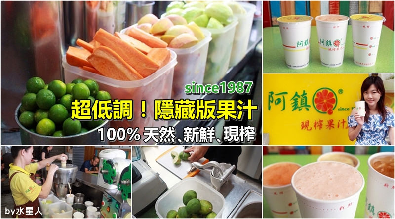 水星人今天分享的這家阿鎮現榨果汁, 1987年就有的老店品牌,開了30年,竟然如此低調, 新鮮現榨的綜合果汁,一喝就讓我覺得相見恨晚, 天啊,怎麼會那麼好喝!!! 一定要推薦給大家!現在水湳店也開幕囉!