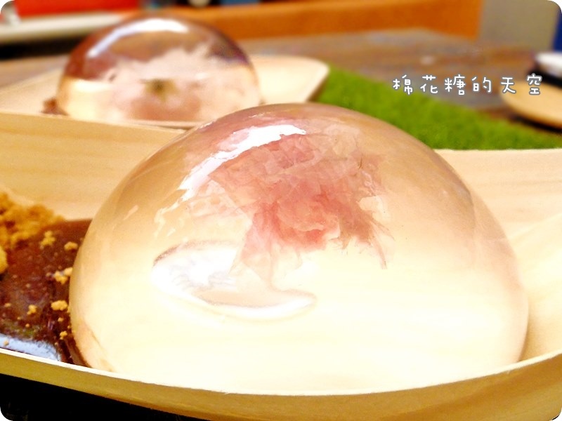超美的啦!這個包著櫻花的水滴~這是傳統日本甜點“水信玄餅”喔!現在不用飛到日本~台中就吃得到這入口即化的好味道唷!最近老闆還在逢甲歡樂星放了水信玄餅的販賣機,裡面還有專屬販賣機的最新奶酪系列~口感超妙的啦!