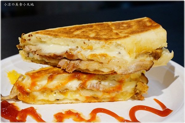 原本是蓬鬆的高度,一經過熱壓後..邪惡的起司流了出來~~豚肉也相當的爭氣爆了!厚度大約在3.5公分左右!!陣陣香氣飄起好誘人!瞬間我的動作快了起來,想要立馬大口開動!