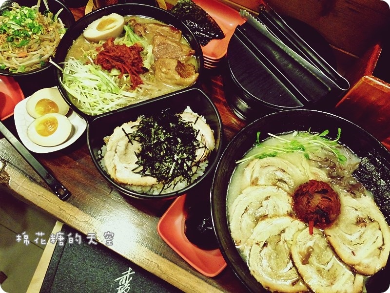 店裡的拉麵湯頭分成三種-秘製豚骨白湯、紅白味增、小豆島醬油~也有乾麵或是蓋飯的選擇,雖然是拉麵店但是種類真的不少啊,點完餐沒有多久~好料就擺滿整個桌子了。