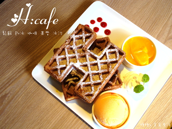 H:Cafe的鬆餅是英文字母H的造型,一份有兩片,上面灑上糖霜,底下搭配芒果醬 外皮好酥脆,咬下去真的會卡滋的那種,好吃,不過底下的芒果醬好甜​